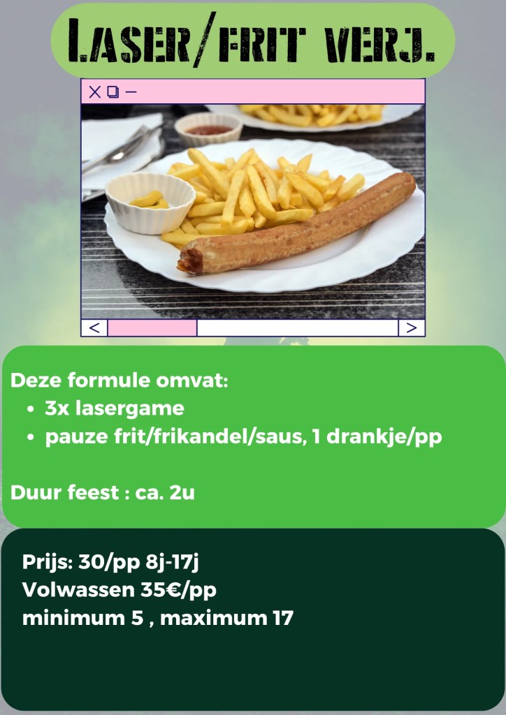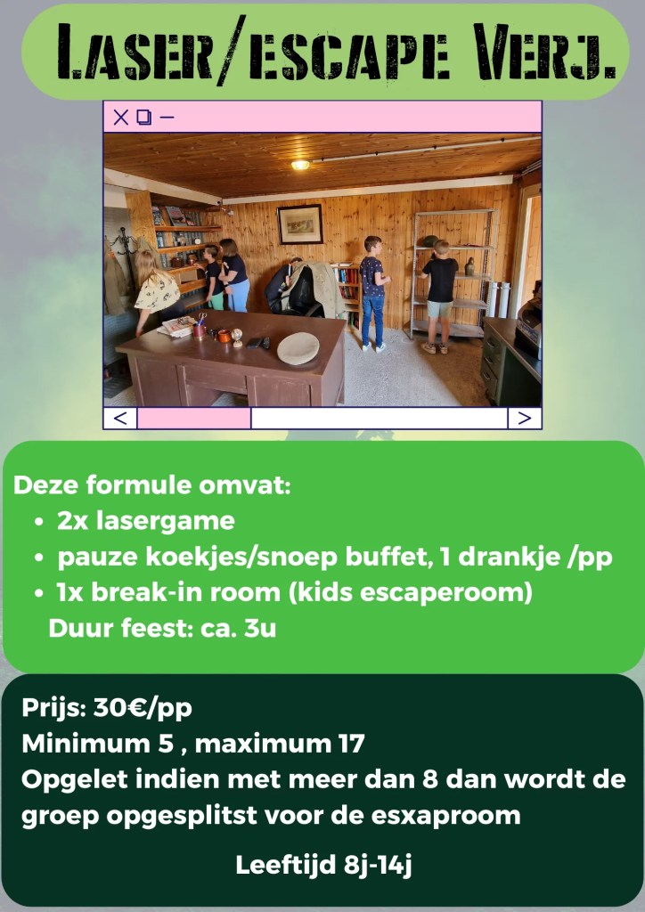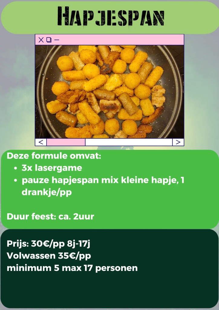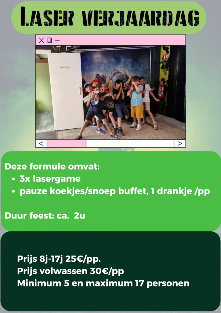 Praktische tip! Voorbeeld nodig je 10 deelnemers uit reserveer dan al voor 7 spelers. We vragen om 1 week voor het feest het juiste aantal door te geven. Zijn het er meer dan kan je bijbetalen zijn het er minder dan betalen we nog terug tot 1 week voor het feest. Vallen er spelers af na die week dan kan je die vervangen door ouders, broer, zus of andere spelers. Omdat er in het verleden teveel de dag ervoor of de dag zelf werd afgezegd is het voor ons nodig om deze regel te hanteren mits de tijdsloten worden vrijgehouden en geen andere spelers kunnen boeken.